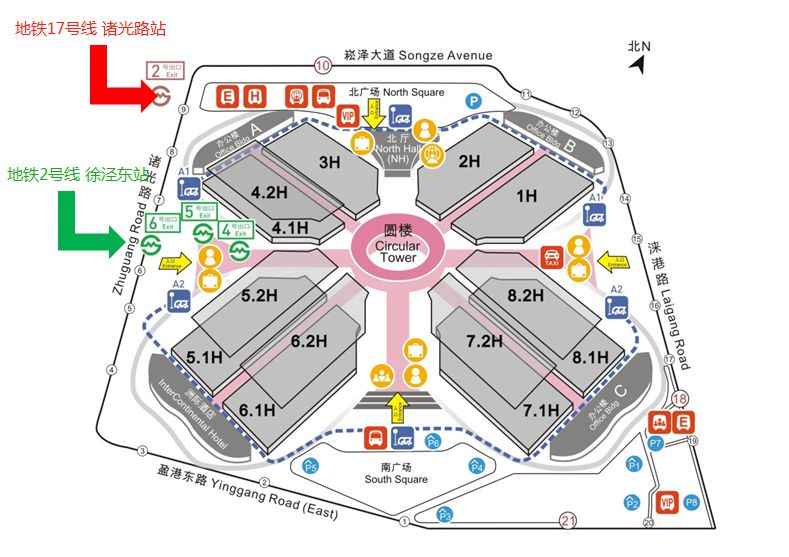 或者地铁17号线,1站到达诸光路站,从2号口可步行至国家会展中心西入口或北入口,但建议从崧泽大道去到10号门进馆。